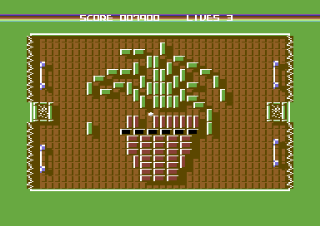 Indeed, the goals may be on any side of the screen, multiple sides at once, or even in the middle of the screen somewhere. You might think that this would be impossible to manage with one bat and you'd be right - that's why you usually have two or even four bats under your control at once! These might be one on top of the other or they might be on opposite sides of the screen but they're all controlled simultaneously simply by using the four joystick directions. The bricks are usually arranged accordingly and often take the shape of particular items rather than just random-looking jumbles. There are a few different brick types though, including the usual basic ones in assorted colours, inconveniently-located unbreakable ones, and glass refractors which are also unbreakable and alter the path of the ball as it passes through. In addition to these there are also generators which release monsters who also deflect the ball as it smashes through their brains.